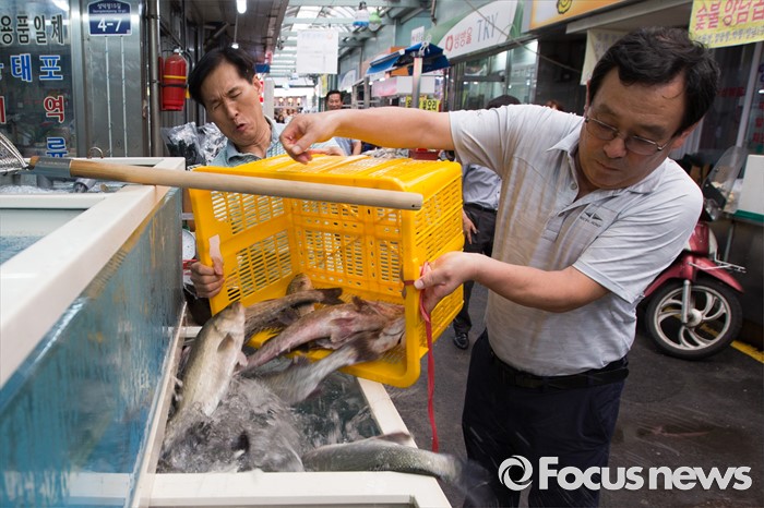 (서울=포커스뉴스) 10일 오후 서울 성동구 뚝도시장에서 성동구청 관계자들이 서해 5도 활어들을 횟집 수족관으로 옮기고 있다. 6월부터 8월까지 2, 4주 금요일에 뚝도시장에 수산물 장서는 날을 운영하며 9월부터는 7일장 형태로 상설운영 할 예정이다.