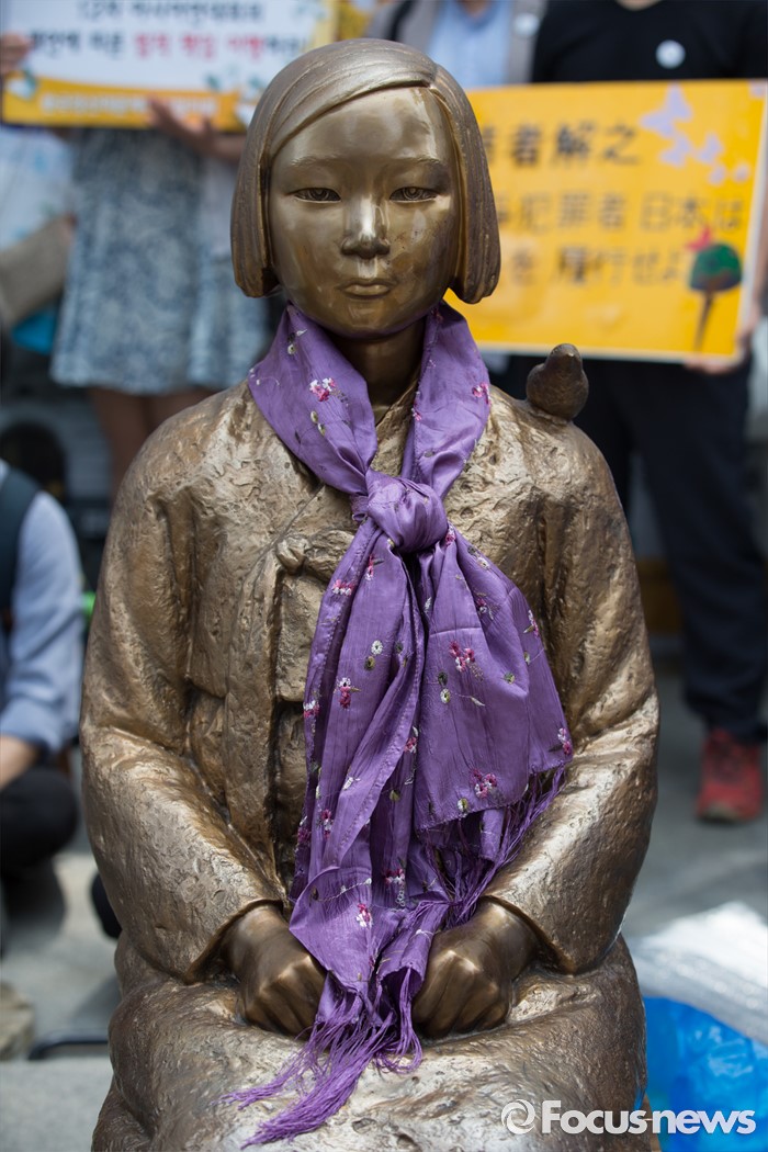 (서울=포커스뉴스) 8일 오후 서울 종로구 옛 일본대사관 앞에서 열린 제 1234차 일본군 위안부 문제해결을 위한 정기 수요시위에 보라색 스카프를 두른 소녀상.
