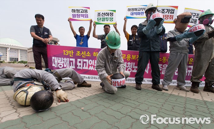 (서울=포커스뉴스) 8일 오전 서울 여의도 국회 앞에서 민주노총 금속노조 조합원들와 조선소 하청업체 직원들이 구조조정 중단과 고용안전 대책을 요구하는 퍼포먼스를 하고 있다.