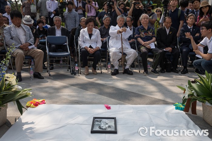 (서울=포커스뉴스) 9일 오후 서울 서대문구 연세대학교 정문 앞에서 열린 '제29주기 이한열 열사 동판 제막식에 배은심(앞줄 왼쪽 두 번째) 이한열 열사의 어머니가 참석하고 있다.