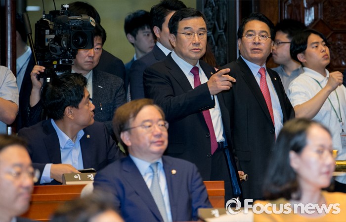 (서울=포커스뉴스) 9일 오전 서울 여의도 국회에서 국회 부의장 후보 선출을 위해 열린 새누리당 의원총회에 국회 부의장 후보 경선에 참여한 심재철(오른쪽), 김정훈 의원이 참석하고 있다.