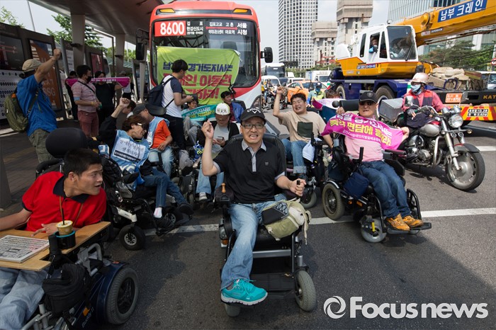 (서울=포커스뉴스) 8일 오후 서울 영등포구 여의도 환승센터 앞에서 경기장애인차별철폐공동투쟁단원들이 장애인 이동권 보장을 촉구하며 경기도행 버스를 막아서고 구호를 외치고 있다.