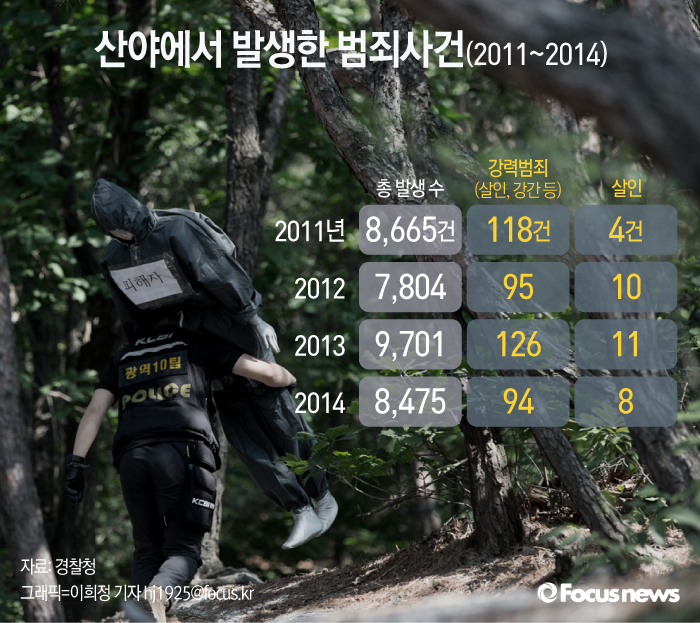 (서울=포커스뉴스) 경찰청이 공개한 범죄통계(2011~2014년)에 따르면 산에서 발생한 범죄는 연간 8600여건에 달한다. 특히 2013년에는 범죄발생 수가 9701건으로 가장 많았는데 살인 역시 11건이나 발생했다.