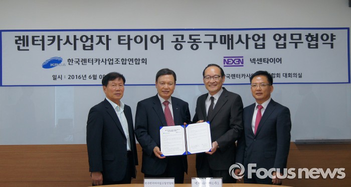 (서울=포커스뉴스) 넥센타이어가 8일 업무협약 체결을 통해 한국렌터카사업조합연합회(KRCA)의 공식 타이어사로 지정됐다.