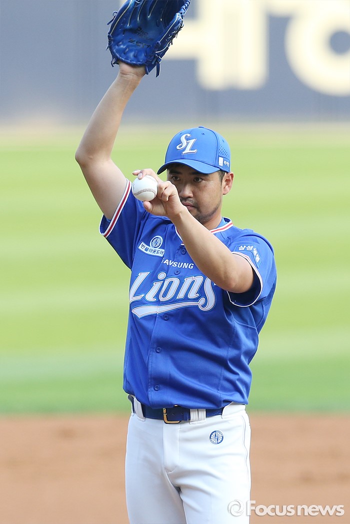 (서울=포커스뉴스) 9일 서울 잠실구장에서 열린 2016 프로야구 삼성-LG 경기에서 삼성 투수 장원삼이 연습 투구를 하며 포수에게 사인을 보내고 있다.