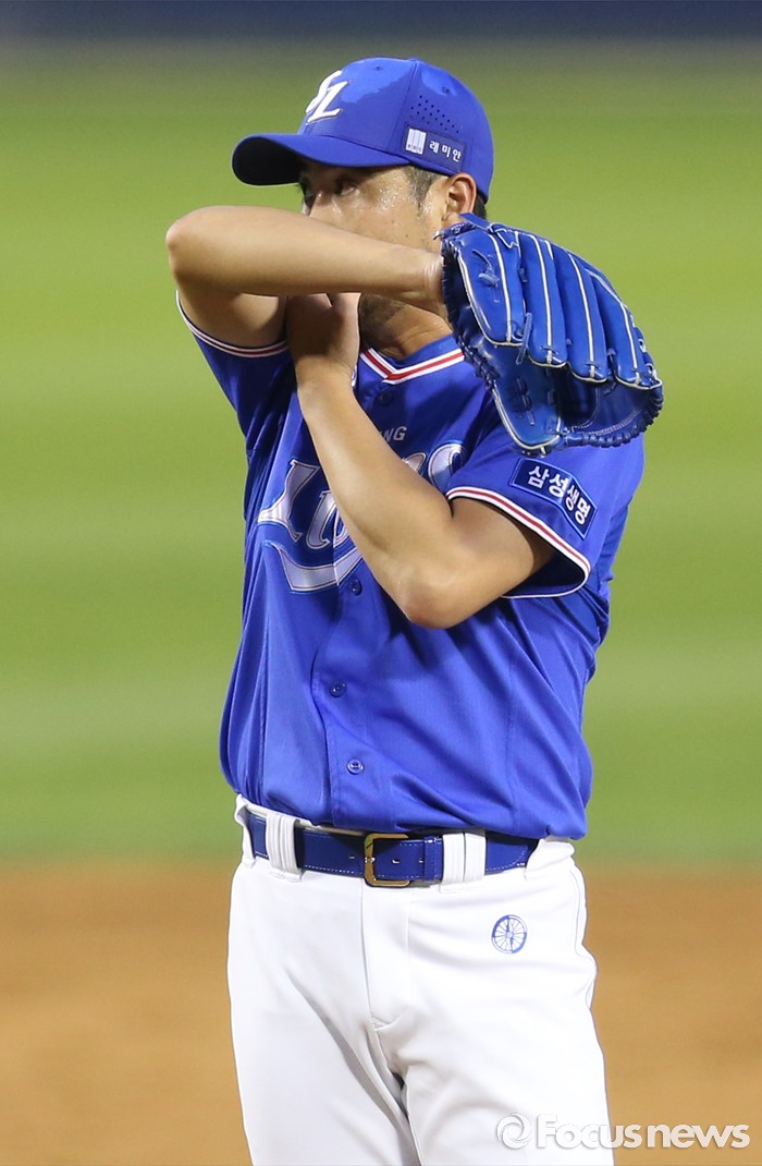 (서울=포커스뉴스) 9일 서울 잠실구장에서 열린 2016 프로야구 삼성-LG 경기에서 LG 유강남에게 5회 연타석 홈런을 허용한 삼성 장원삼이 얼굴의 땀을 닦고 있다.