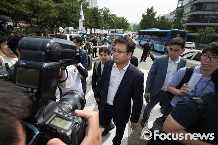 (서울=포커스뉴스) 세월호 특조위 윤천우 조사2과장이 산케이신문 전 서울지국장 사건 관련 자료 확보를 위해 실지조사에 나선 8일 오전 서울 서초구 서울중앙지검 삼거리에서 세월호 특조위 해체를 촉구 기자회견하는 고엽제전우회 회원 앞을 지나 지검으로 향하고 있다.