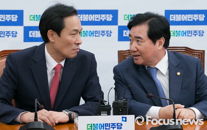 (서울=포커스뉴스) 우상호(왼쪽) 더불어민주당 원내대표가 8일 오후 서울 여의도 국회에서 새누리당의 국회의장직을 야당이 맡고 운영 및 법사위를 여당이 맡자는 제안과 관련 논의를 위한 4선 이상 중진 의원과의 간담회에 참석해 이석현 의원을 대화하고 있다.