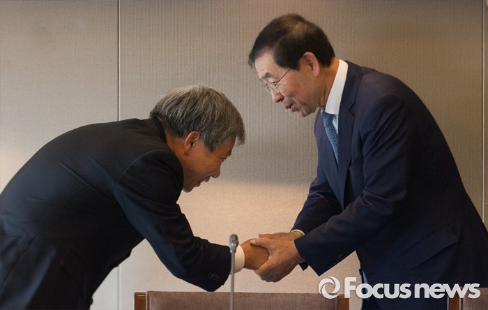 (서울=포커스뉴스) 박원순(오른쪽) 서울시장이 8일 오후 서울 중구 프레스센터에서 열린 2016 제1회 서울시 노사민정협의회 본회의에 참석해 이동응 한국경영자총협회 전무와 악수하고 있다. 서울시 노사민정협의회 구성 후 협의회구성원 모두가 한자리에 모이는 것은 15년 만이다.