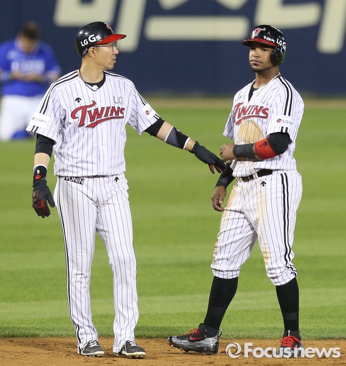 (서울=포커스뉴스) 8일 서울 잠실구장에서 열린 2016 프로야구 삼성-LG 경기 4회말 무사 만루에서 삼성 투수 교체때 LG 3루주자 정성훈이 장필준의 투구에 맞고 진루한 2루주자 히메네스를 위문하고 있다.