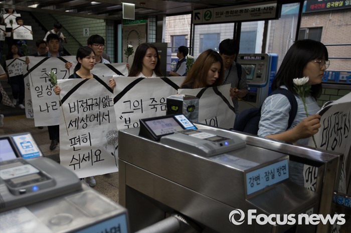 (서울=포커스뉴스) 지난달 28일 서울 지하철 2호선 구의역에서 스크린도어 정비 도중 숨진 김 모씨의 발인을 하루 앞둔 8일 오후 서울 광진구 지하철 2호선 구의역에서 시민들이 김 모씨를 추모하며 행진하고 있다.