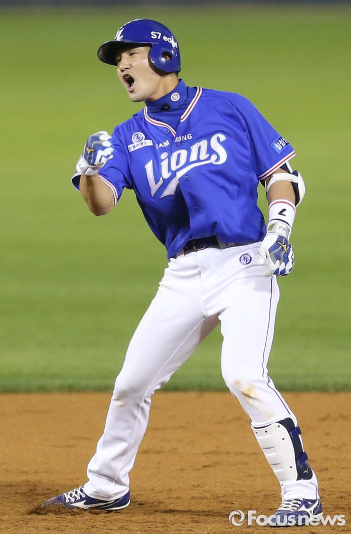 (서울=포커스뉴스) 7일 서울 잠실구장에서 열린 2016 프로야구 삼성-LG 경기 8회초 1사 만루에서 삼성 김상수가 주자를 모두 불러 들이는 역전 2루타를 치고 어퍼컷 세레머니를 하며 환호하고 있다.