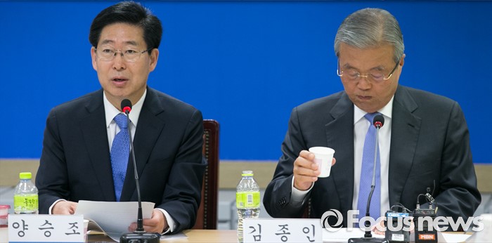 (서울=포커스뉴스) 8일 오전 서울 여의도 민주정책연구원에서 '건강보험 부과체계 개편 방안' 주제로 열린 사회경제포럼에 참석한 양승조 더불어민주당 의원이 발언하고 있다. 오른쪽은 김종인 비대위 대표.