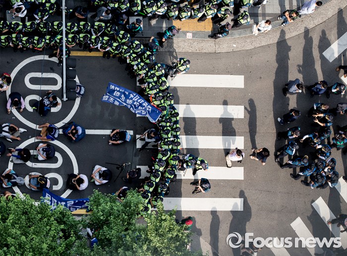 (서울=포커스뉴스) 사내하청 전원 정규직화를 요구하며 고공농성을 벌여온 기아자동차 사내하청 노동자 최정명씨와 한규협씨가 농성을 해제한 8일 오후 서울 중구 옛 국가인권위원회 건물 옥상 광고탑 농성장에서 내려와 병원으로 이동하던 중 경찰과 노조원들이 실랑이를 벌이고 있다.