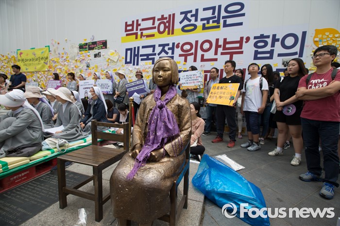 (서울=포커스뉴스) 8일 오후 서울 종로구 옛 일본대사관 앞에서 열린 제 1234차 일본군 위안부 문제해결을 위한 정기 수요시위에서 참가자들이 소녀상 주위로 모여 있다.