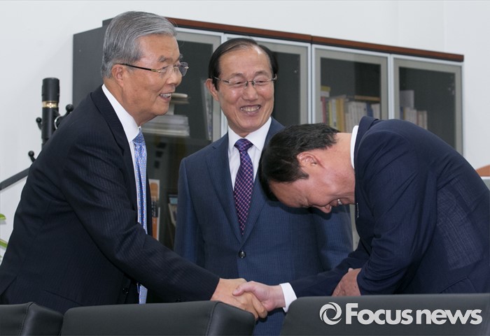(서울=포커스뉴스) 김종인(왼쪽) 더불어민주당 비대위 대표가 10일 오후 서울 여의도 국회를 방문한 이원종(가운데) 대통령비서실장, 김재원 청와대 정무수석과 면담에 앞서 인사하고 있다.