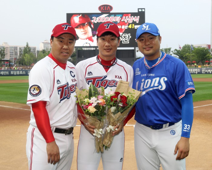 김주찬은 지난달 29일 광주구장에서 열린 NC와의 경기에서 역대 41번째 개인통산 2000루타 기록을 세웠다.프로야구 KIA 김주찬(가운데)가 10일 광주구장에서 펼쳐진 삼성과의 경기에 앞서 열린 개인통산 2000루타 시상식에서 이범호(왼쪽)와 박한이로부터 축하를 받고 있다. <사진제공=KIA 타이거즈>