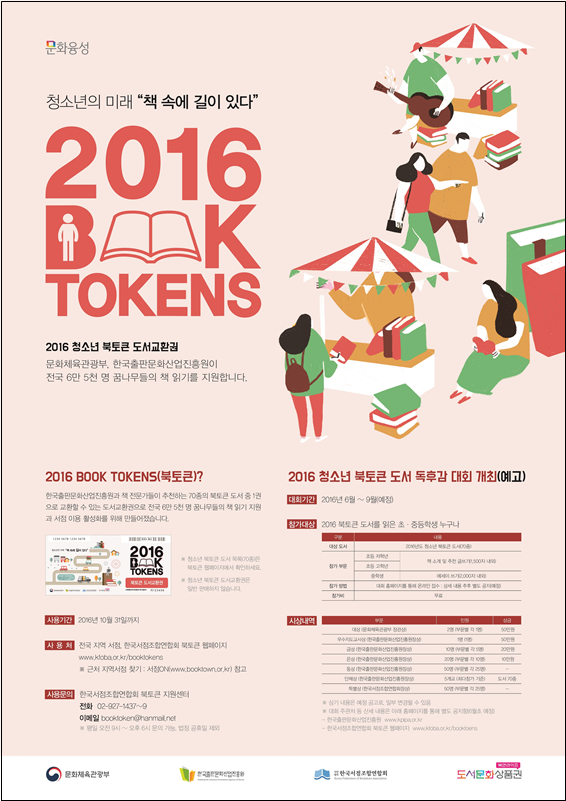 문화체육관광부는 10일 "한국출판문화산업진흥원과 한국서점조합연합회와 함께 서울 강남구 코엑스(COEX)에서 개최되는 2016 서울국제도서전에서 어린이와 청소년을 위한 북토큰 사업을 펼친다"고 밝혔다.