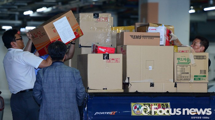 (서울=포커스뉴스) 10일 오후 서울 중구 소공동 롯데호텔에서 검찰 수사관들이 롯데그룹 정책본부 등 계열와 신동빈 롯데그룹 회장 집무실에서 압수수색한 서류를 화물차에 싣고 있다.