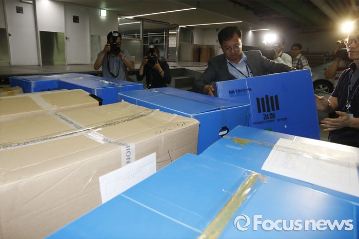 (서울=포커스뉴스) 10일 오후 서울 중구 소공동 롯데호텔에서 검찰 수사관들이 롯데그룹 정책본부 등 계열와 신동빈 롯데그룹 회장 집무실에서 압수수색한 서류를 화물차에 싣고 있다.
