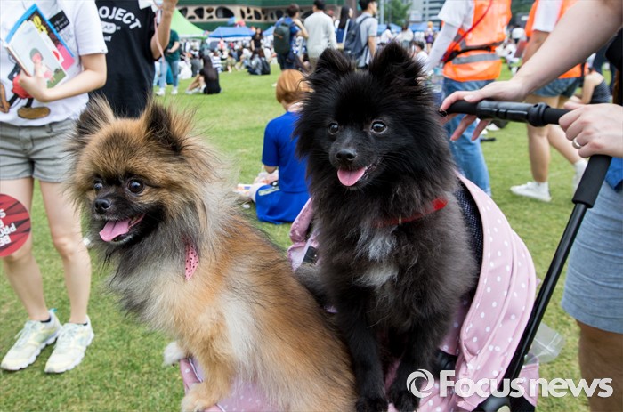 (서울=포커스뉴스) 11일 오후 서울광장에서 열린 제17회 퀴어문화축제에서 한 참가자가 애견과 함께 축제를 즐기고 있다.