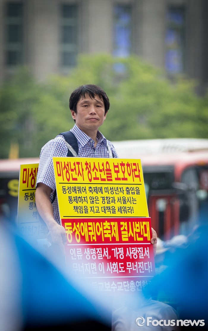 (서울=포커스뉴스) 11일 오후 서울 중구 대한문 앞에서 열린 '2016 서울광장 동성애축제 반대 국민대회'에서 한 참석자가 동성애를 반대하는 손팻말을 들고 있다.