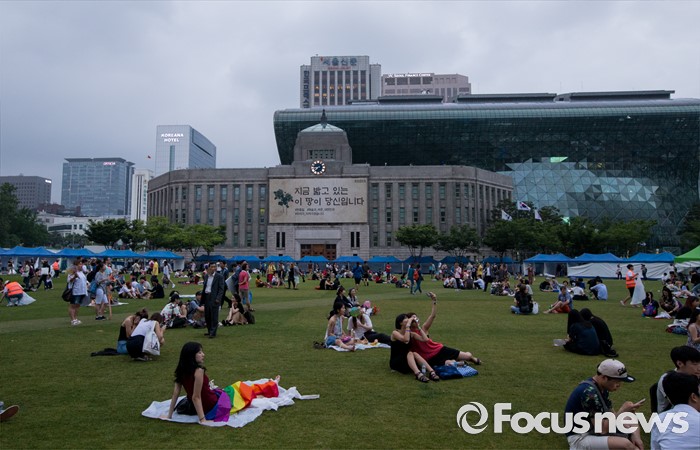 (서울=포커스뉴스) 11일 오후 서울광장에서 열린 제17회 퀴어문화축제가 마친 후 참가자들이 휴식을 즐기고 있다.