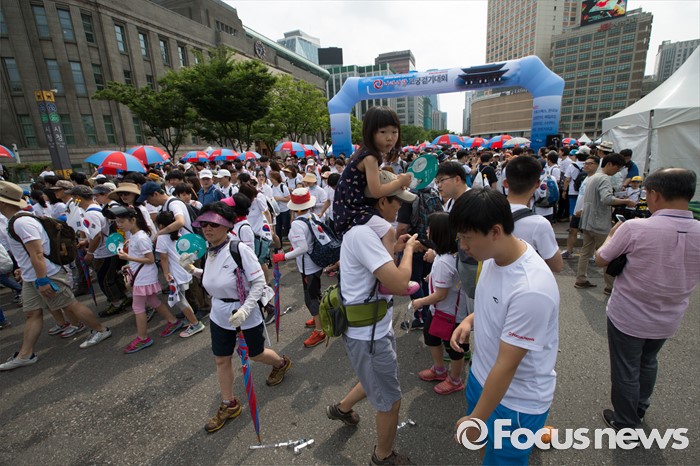 (서울=포커스뉴스) 12일 오전 서울 중구 서울시청 광장에서 열린 제 7회 나라사랑 고궁걷기 대회에 참가한 시민들이 출발하고 있다.