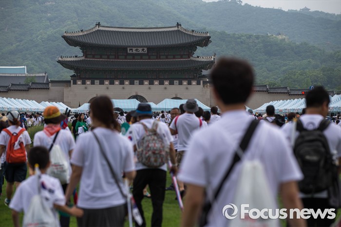 (서울=포커스뉴스) 12일 오전 서울 중구 서울시청 광장에서 열린 '제7회 나라사랑 고궁걷기 대회'에 참가한 시민들이 경복궁을 향해 걷고 있다.