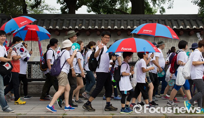 (서울=포커스뉴스) 12일 오전 서울 중구 서울시청 광장에서 열린 제 7회 나라사랑 고궁걷기 대회에 참가한 시민들이 경복궁을 향해 걷고 있다.