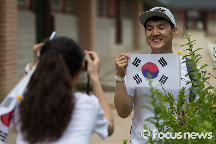 (서울=포커스뉴스) 12일 오전 서울 중구 서울시청 광장에서 열린 제 7회 나라사랑 고궁걷기 대회에 참가한 시민들이 기념촬영을 하고 있다.