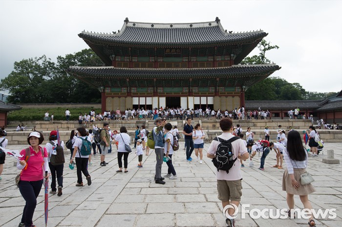 (서울=포커스뉴스) 12일 오전 서울 종로구 창덕궁에서 '제7회 나라사랑 고궁걷기 대회'에 참가한 시민들이 인정전을 둘러보고 있다.
