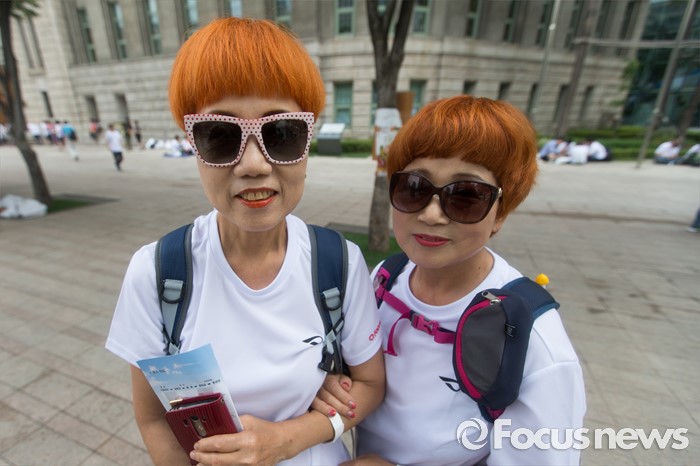 수많은 사람 중 유독 이목을 집중시킨 두 여성이 있다. 경기도 양주시에서 온 최순교(65) 씨와 경기도 의정부시에서 온 최영숙(60) 씨다. 둘은 친자매다. 머리부터 발끝까지 옷맵시를 뽐냈다. 헤어스타일은 바가지 스타일에 오렌지색으로 염색했다. 립스틱도 머리색과 동일한색으로 맞췄다. 주황색과 보라색의 원색 바지 역시 눈에 확 띄었다.