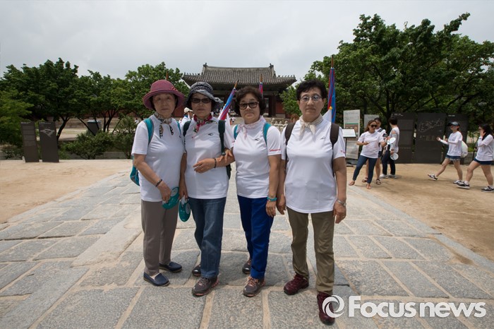 (서울=포커스뉴스) 12일 오전 서울 종로구 창경궁에서 '제7회 나라사랑 고궁걷기 대회'에 참가한 시민들이 기념촬영을 하고 있다.
