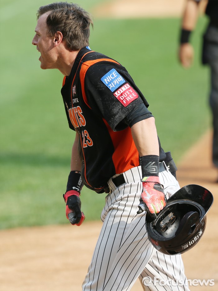(서울=포커스뉴스) 12일 서울 잠실구장에서 열린 2016 프로야구 롯데-두산 경기 3회초 롯데 선두타자 아두치가 중견수를 넘기는 3루타와 송구 실책을 틈타 홈까지 달려 슬라이딩하며 득점하고 덕아웃으로 향하고 있다.