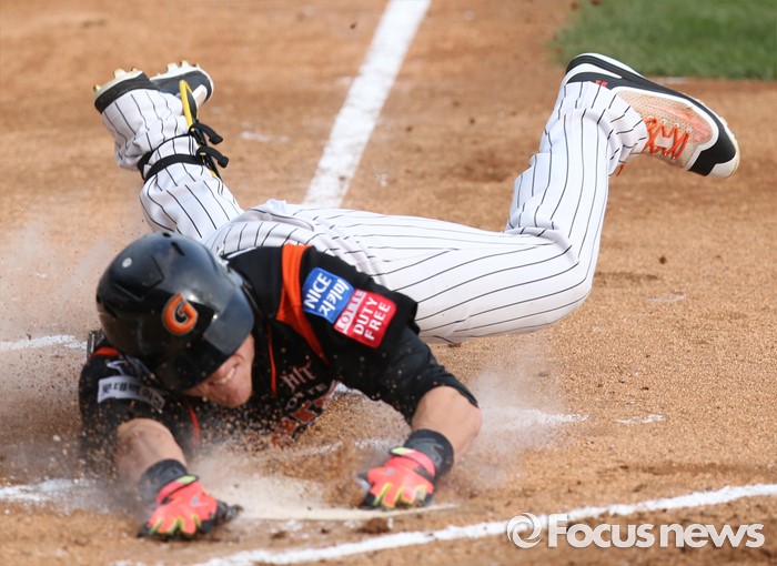 (서울=포커스뉴스) 12일 서울 잠실구장에서 열린 2016 프로야구 롯데-두산 경기 3회초 롯데 선두타자 아두치가 중견수를 넘기는 3루타와 송구 실책을 틈타 홈까지 달려 슬라이딩하며 세이프되고 있다.