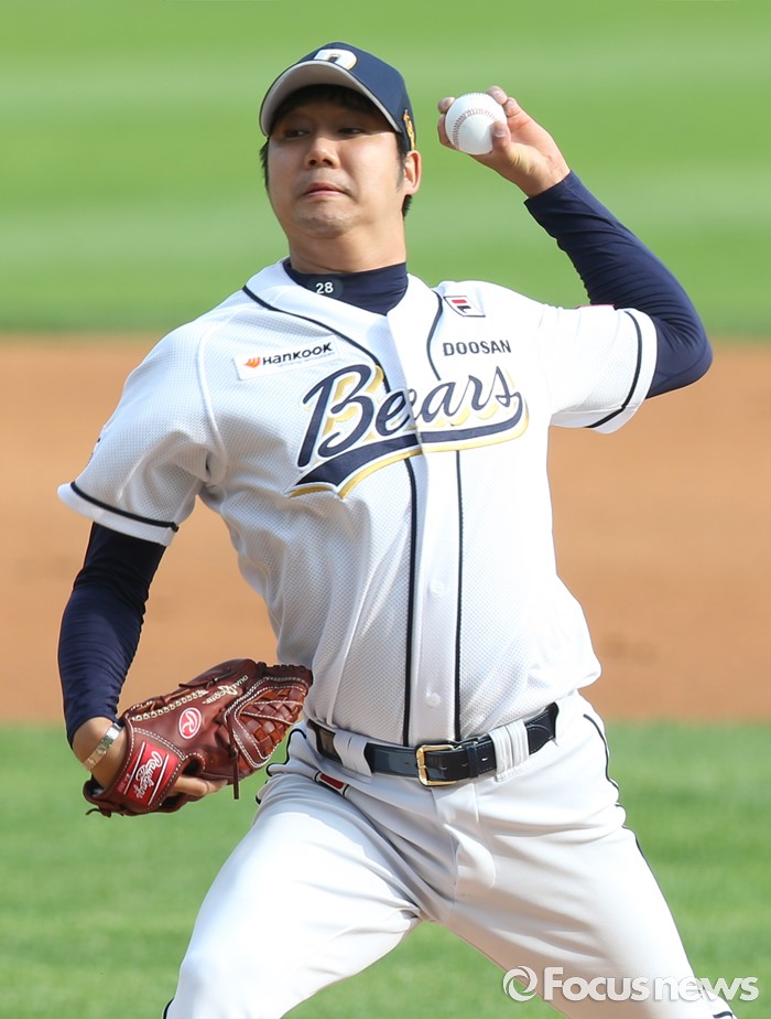 (서울=포커스뉴스) 12일 서울 잠실구장에서 열린 2016프로야구 롯데-두산 경기에서 1회초 두산 선발투수 장원준이 투구하고 있다.