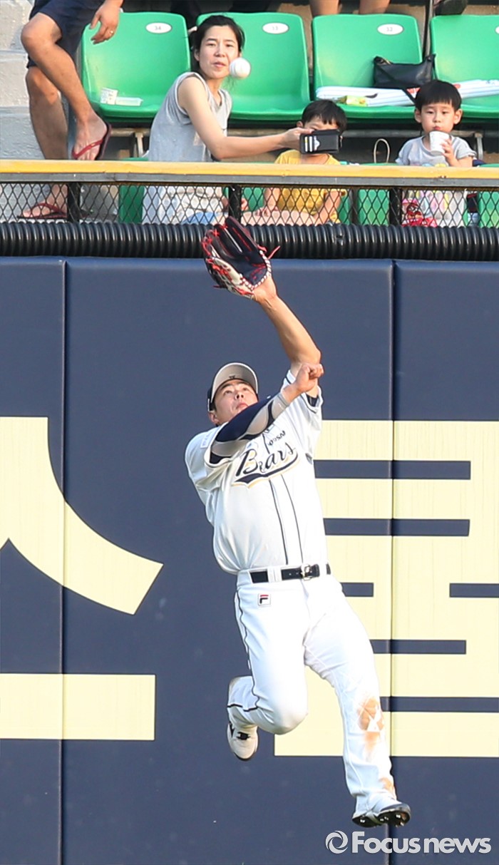 (서울=포커스뉴스) 12일 서울 잠실구장에서 열린 2016 프로야구 롯데-두산 경기 7회초 두산 좌익수 김재환이 롯데 아두치의 외야플라이를 펜스 앞에서 점프해 잡고 있다.