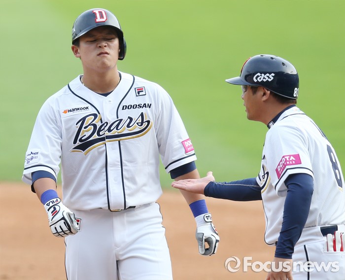 (서울=포커스뉴스) 12일 서울 잠실구장에서 열린 2016 프로야구 롯데-두산 경기 4회말 무사 1,2루에서 두산 국해성이 중전 안타를 치고 1루에서 강동우 코치의 축하를 받고 있다.
