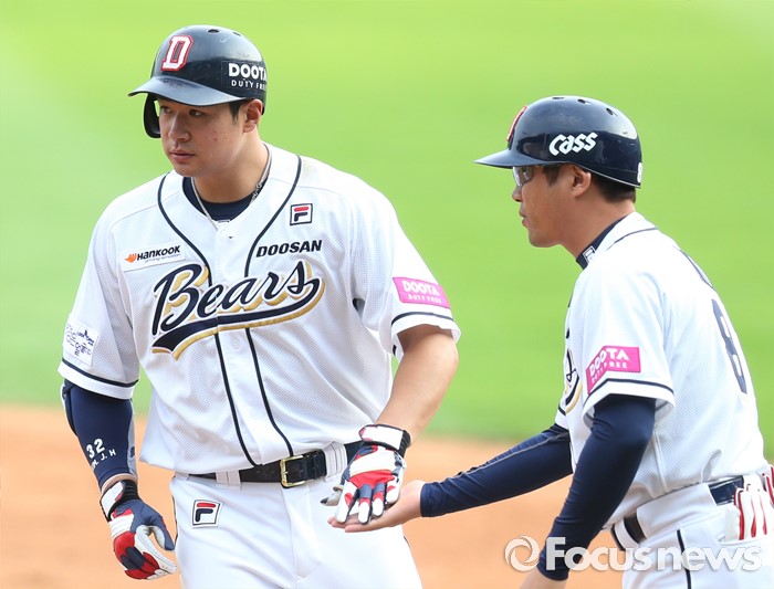 (서울=포커스뉴스) 12일 서울 잠실구장에서 열린 2016 프로야구 롯데-두산 경기 4회말 무사 1루에서 두산 김재환이 중전 안타를 치고 강동우 코치와 손을 마주치고 있다.