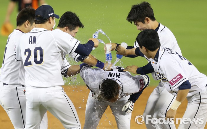 (서울=포커스뉴스) 12일 서울 잠실구장에서 열린 2016 프로야구 롯데-두산 경기에서 연장 11회말 끝내기 2루타를 친 두산 민병헌에게 동료들이 축하의 물세례를 하고 있다.