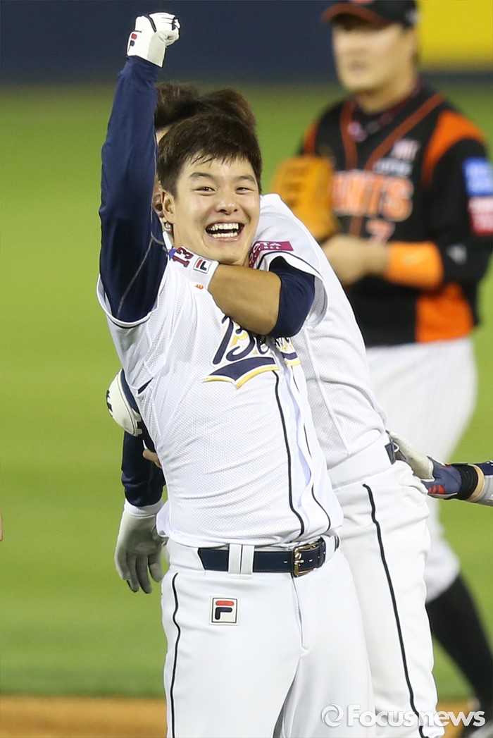 △ 끝내기 2루타 치고 환호하는 두산 민병헌
