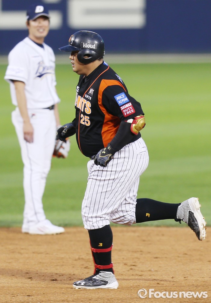 (서울=포커스뉴스) 12일 서울 잠실구장에서 열린 2016 프로야구 롯데-두산 경기 9회초 2사 2루에서 롯데 최준석이 동점 우월 홈런을 치고 그라운드를 달리고 있다.