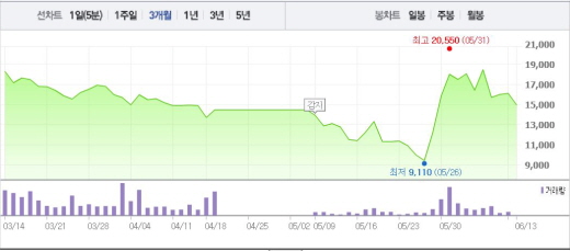 현대상선은 해외 선주들에게 3년 반 동안 내야할 용선료(2조500억원)의 21%인 5300억원 인하 합의를 발표했다.주가흐름<사진출처=네이버 캡쳐>