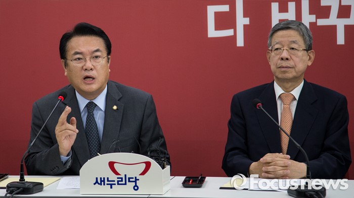 (서울=포커스뉴스) 정진석(왼쪽) 새누리당 원내대표가 13일 오전 서울 여의도 국회에서 열린 혁신비상대책위원회 회의에서 구의역 스크린도어 수리공 사망 사고 원인 중 하나로 서울메트로의 낙하산 인사가 거론되는 것과 관련해 문재인 전 대표를 비판하고 있다.