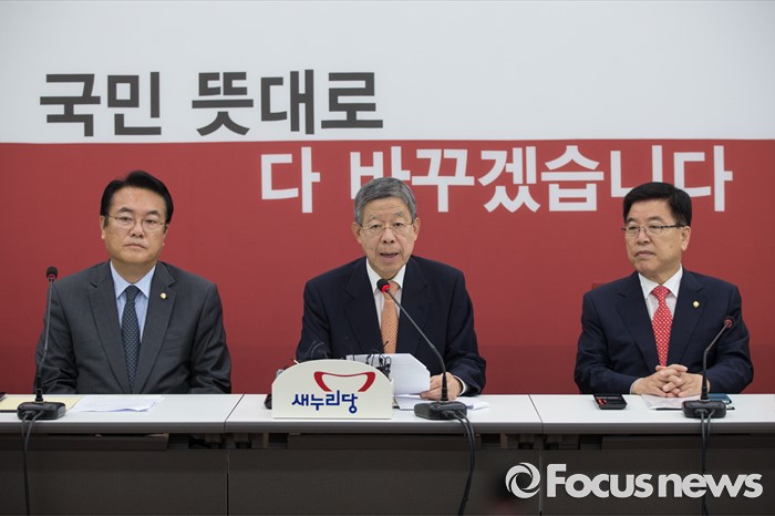 (서울=포커스뉴스) 김희옥(가운데) 새누리당 비상대책위원장이 13일 오전 서울 여의도 국회에서 열린 혁신비상대책위원회의에 참석해 발언하고 있다. 왼쪽부터 정진석 원내대표, 김 위원장, 김광림 정책위의장