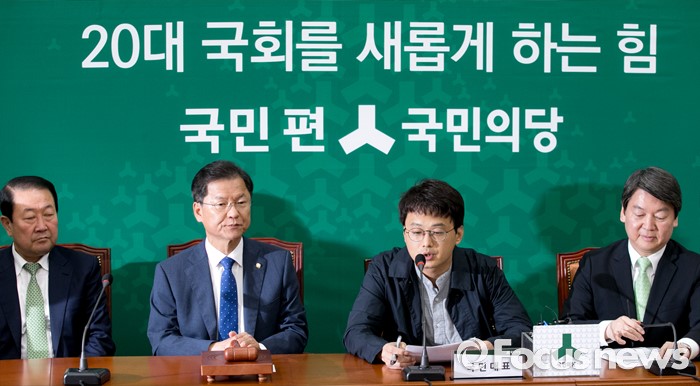 (서울=포커스뉴스) 13일 오전 서울 여의도 국회에서 열린 국민의당 최고위원회의에 국민대표로 참석한 최정진 시인이 발언하고 있다. 오른쪽부터 안철수 상임공동대표, 최 시인, 천정배 공동대표, 박주선 국회 부의장.