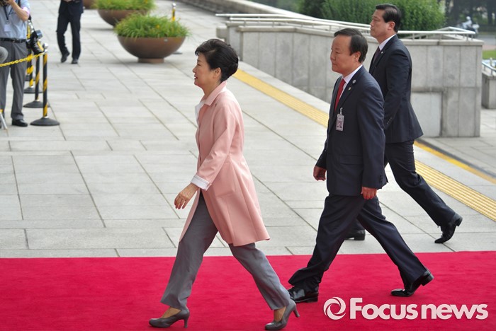 (서울=포커스뉴스) 박근혜 대통령이 13일 오전 서울 여의도 국회에서 열린 20대 국회 개원식 연설을 위해 본청으로 들어서고 있다.