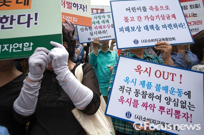| △ 옥시 퇴출 외치며 손팻말 든 소비자단체 |