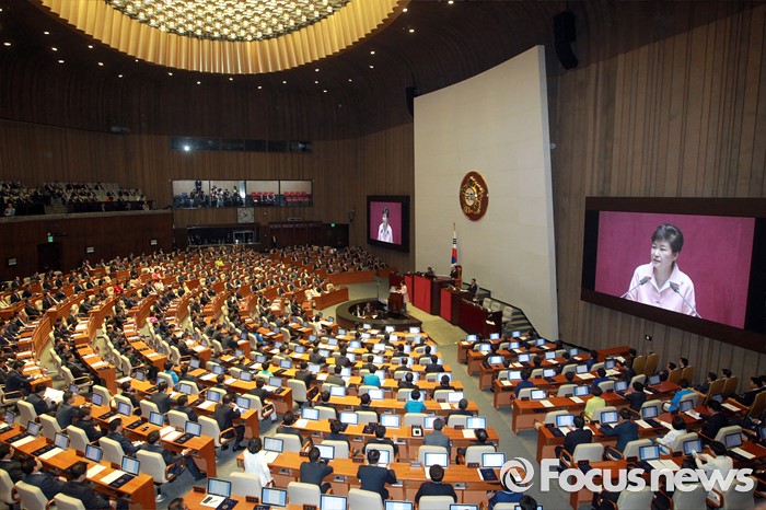 (서울=포커스뉴스) 박근혜 대통령이 13일 오전 서울 여의도 국회에서 열린 20대 국회 개원식에 참석해 연설을 하고 있다.